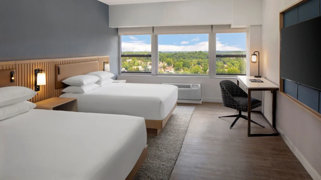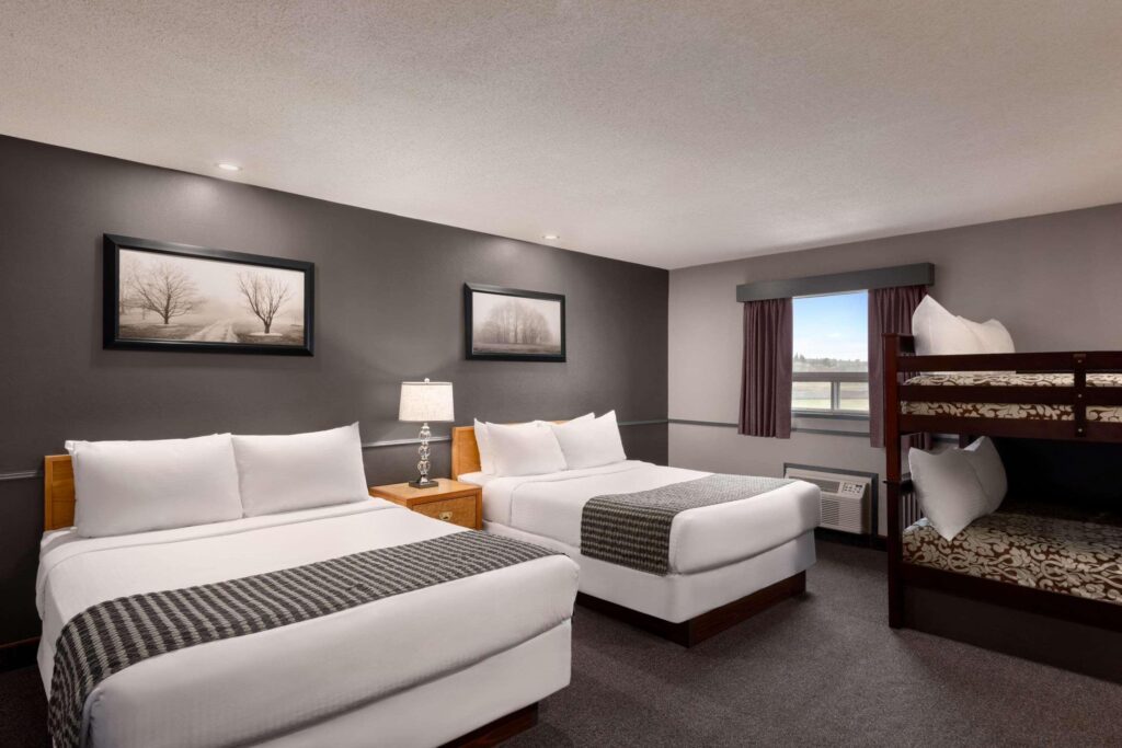 The Upper Deluxe room offers two queen beds and a sleeper sofa for extra comfort. It includes a mini-fridge, microwave, coffee maker, and in-room safe, providing convenience and relaxation during your stay.