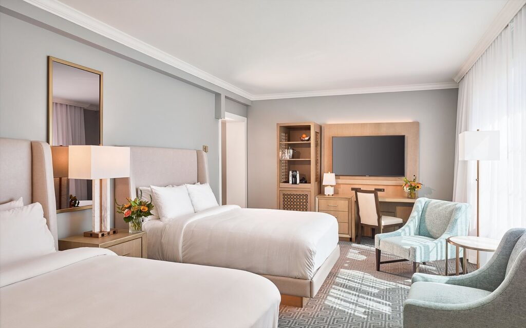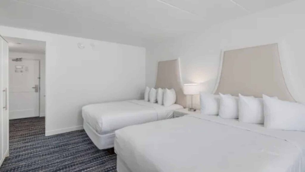 This Standard Poolside room features two double beds, a small table with two chairs for seating, and conveniences such as a small fridge, microwave, coffee maker, and in-room safe, ensuring a comfortable and practical stay.
